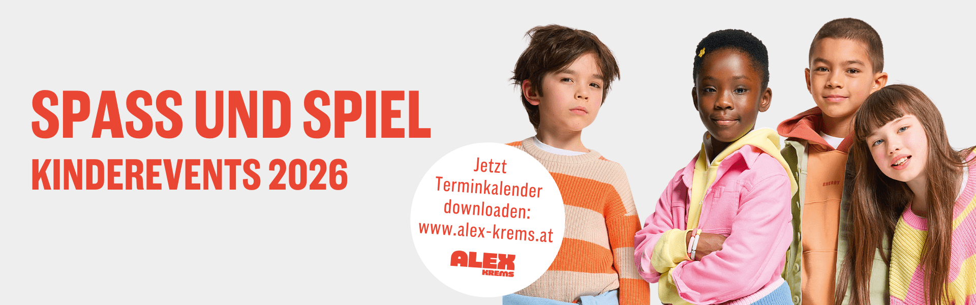 - Kinderevents ALEX Krems 2026Bist du bereit für das Kinderevent-Programm 2026 im ALEX Krems? Es wartet ein Jahr voller Spiele und Spaß auf die Kleinsten!