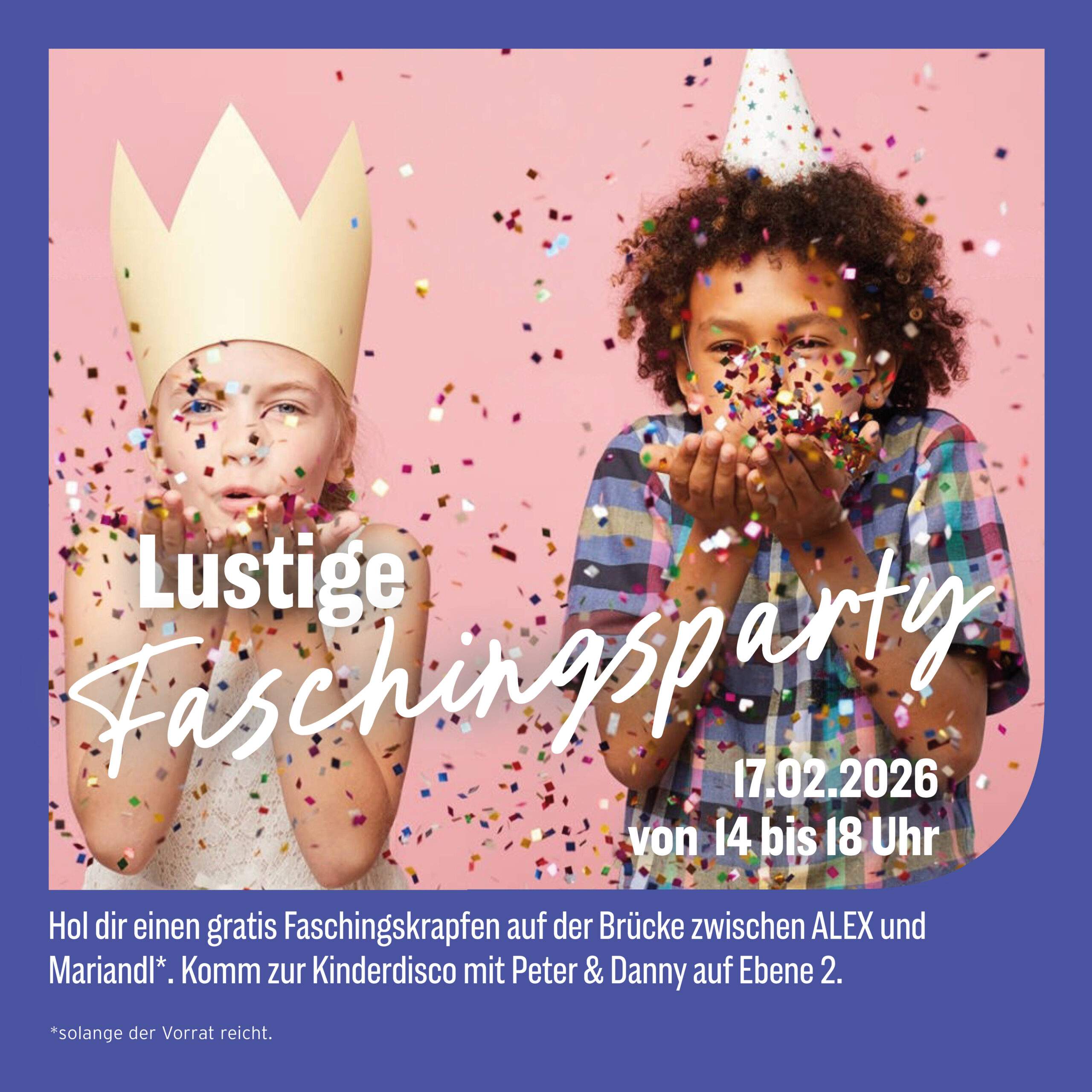 Hol dir deinen Stempelpass und sammle alle Stempel! Mit einem vollen Pass bekommt jedes Kind auf der Brücke zwischen ALEX und Mariandl einen gratis Faschingskrapfen*.