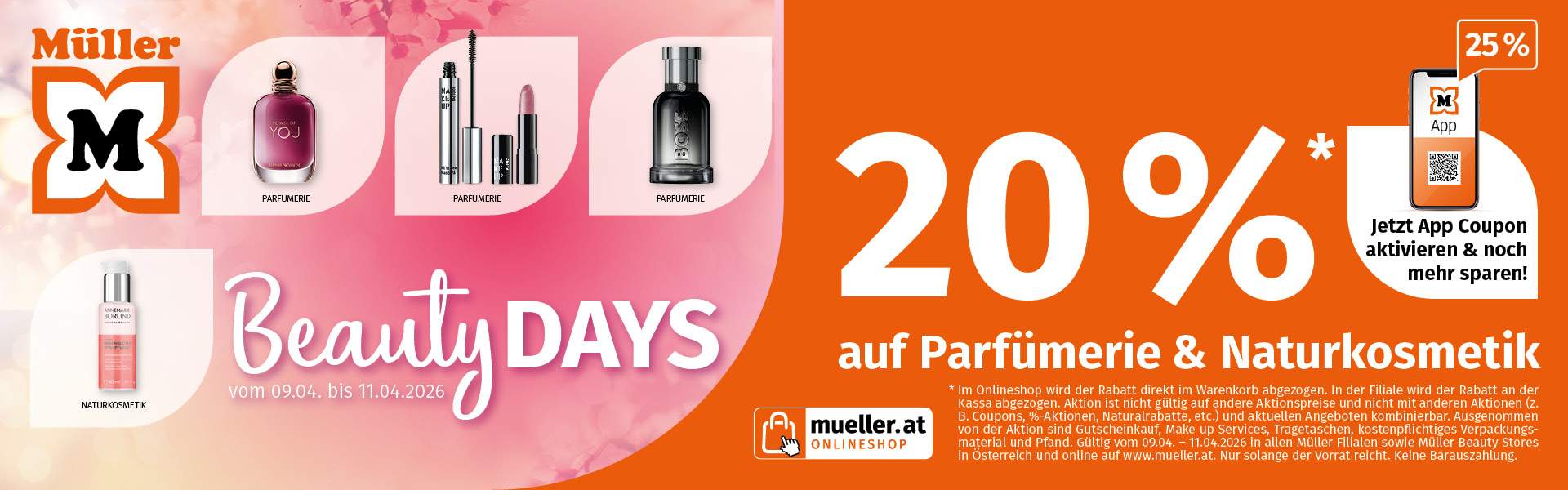 *Im Onlineshop wird der Rabatt direkt im Warenkorb abgezogen. In der Filiale wird der Rabatt an der Kassa abgezogen. Aktion ist nicht gültig auf andere Aktionspreise und nicht mit anderen Aktionen (z. B. Coupons, %-Aktionen, Naturalrabatte, etc.) und aktuellen Angeboten kombinierbar. Ausgenommen von der Aktion sind Gutscheinkauf, Make up Services, Tragetaschen, kostenpflichtiges Verpackungsmaterial und Pfand. Gültig vom 09.04. – 11.04.2026 in allen Müller Filialen sowie Müller Beauty Stores in Österreich und online auf www.mueller.at. Nur solange der Vorrat reicht. Keine Barauszahlung.