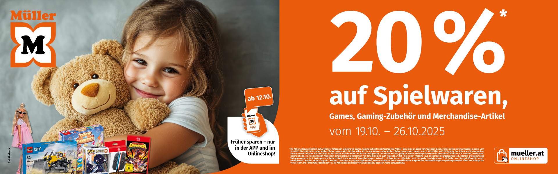 *Die Aktion gilt ausschließlich auf Artikel der Kategorien „Spielwaren, Games, Gaming-Zubehör und Merchandise Artikel“. Die Aktion ist gültig vom 12.10.2025 bis 26.10.2025 online auf www.mueller.at sowie vom 19.10.2025 bis 26.10.2025 in allen Müller Filialen in Österreich. Mit der Müller APP ist die Aktion in allen Müller Filialen in Österreich bereits vom 12.10.2025 bis 18.10.2025 gültig. Der Rabatt wird im Onlineshop bereits im Verkaufspreis berücksichtigt. In den Filialen wird der Rabatt an der Kassa abgezogen. Die Aktion ist nicht gültig auf andere Aktionspreise und nicht mit anderen Aktionen (z.B. Coupons, %-Aktionen, Naturalrabatte, etc.) und aktuellen Angeboten kombinierbar. Ausgenommen von der Aktion sind auch folgende Artikel / Hersteller: Produkte i.S.d. Buchpreisbindungsgesetzes (z.B. Bücher), preisgebundene Verlagserzeugnisse (z.B. Zeitungen und Zeitschriften), Gutscheinkauf, Dienstleistungen, Network / Online Karten, Hörbücher und Hörspiele, Spielekonsolen / VR-Brillen von Nintendo / Sony / Microsoft, Smartphones / Handys, Tablets, Airpods / Earpods, TV-Geräte, PC / Laptop, Apple-Artikel, Amazon-Artikel, OOONO, Prepaid-Karten, Tragetaschen, kostenpflichtiges Verpackungsmaterial und Pfand. Nur solange der Vorrat reicht. Die Firma Müller behält sich vor, die Aktion jederzeit ohne Vorankündigung zu beenden. Keine Barauszahlung.
