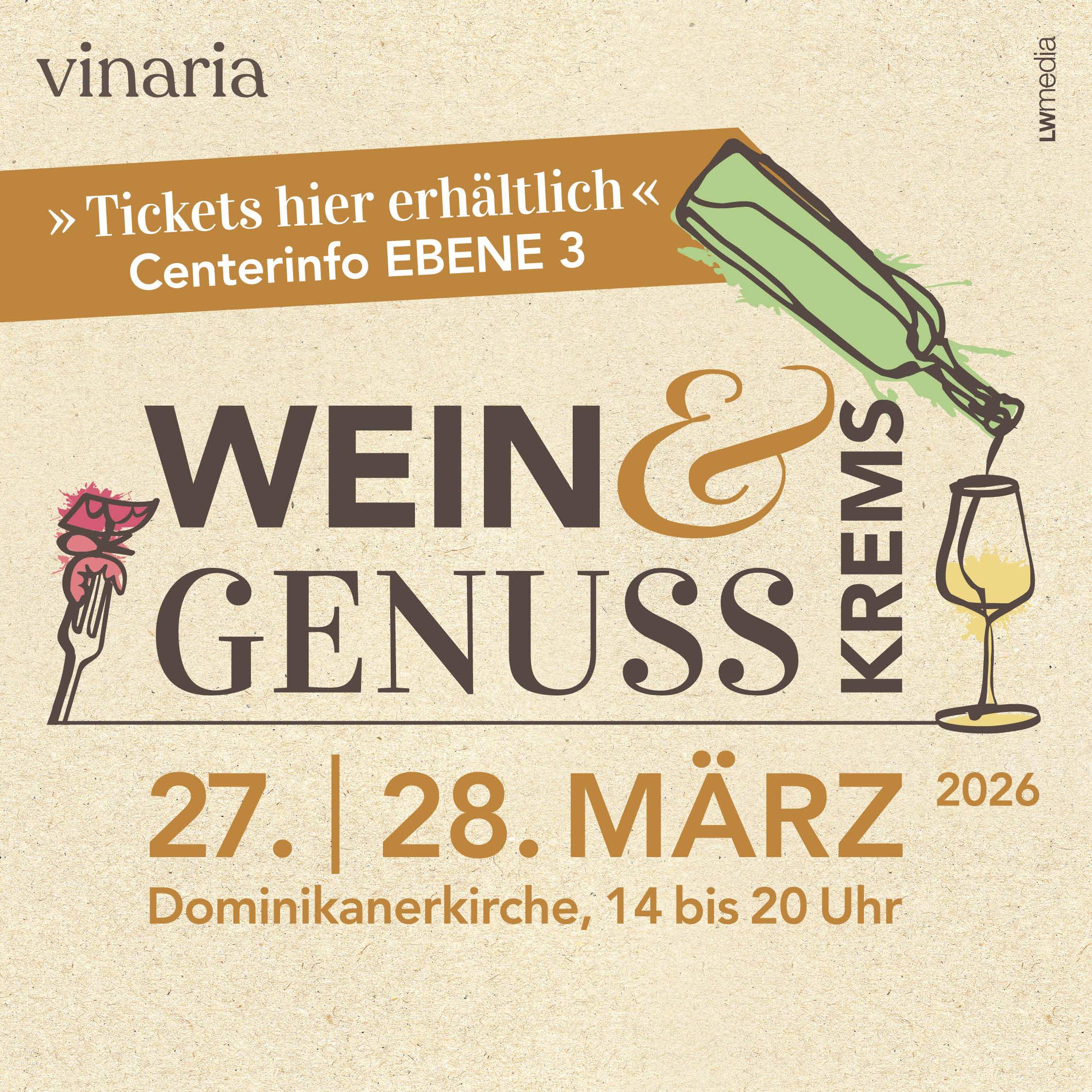 Tickets für die Weinmesse gibt’s ab sofort in der Centerinfo auf Ebene 3 im ALEX Krems!