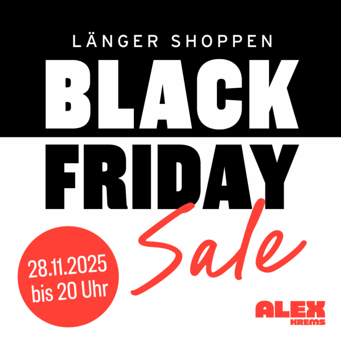 Der Countdown läuft: Am Freitag, 28. November 2025 erwartet dich der Black Friday Sale im ALEX Krems. Länger shoppen bis 20 Uhr mit attraktiven Rabatten und top Beratung in allen Stores!