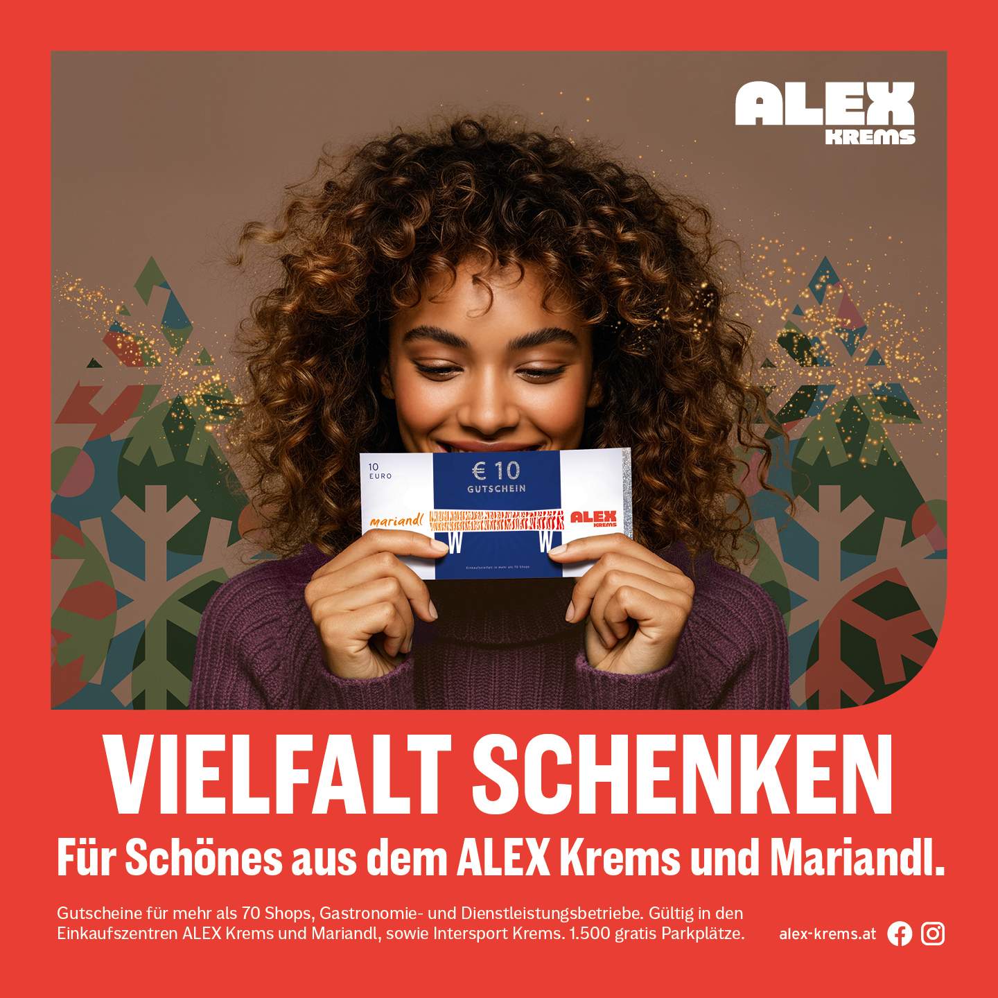 Mit ALEX Krems Einkaufsgutscheinen schenkst du Vielfalt! Unsere Gutscheine sind in 70 Shops, Gastronomie- und Dienstleistungsbetrieben gültig. Diese sind nicht nur im ALEX Krems, sondern auch bei unserem Nachbarn Mariandl und Intersport Krems einlösbar. Bei der Auswahl und dem perfekten Mix an Angeboten sind ALEX Krems Einkaufsgutscheine zu jedem Anlass das perfekte Geschenk.